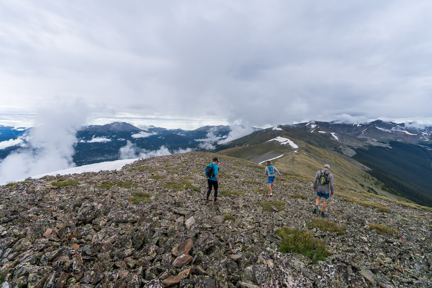 I recently survived running on mountain tops. The objective was the Ten Mile Range traverse from Frisco to Breckenridge, Colorado. The result was over 7000 feet of elevation gain and bagging 9 out of 10 peaks before the rain washed us down the mountain.